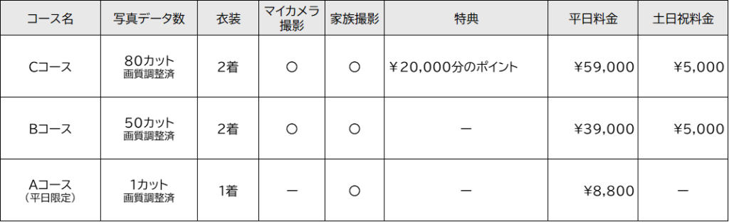 コースの中に、お好きなアイテム購入に充てられる「ポイント」を設定いたします。 「この写真はパネルにしたい」「アクリルキーホルダーを作りたい」など、ご自身のこだわりたいポイントに合わせて、追加料金を気にせずスマートに商品・サービスをお選びいただけます。