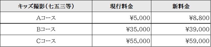 この度、今後もより質の高い写真と快適な撮影環境をお客様に提供し続けるため、誠に勝手ながらキッズ部門での撮影料金を、2026年3月1日以降に承る新規ご予約分より、下記の通り改定させていただくこととなりました。
