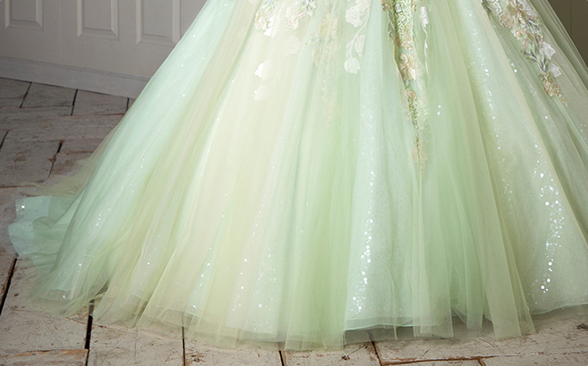 ふわふわチュールが今っぽくてかわいいカラードレス。