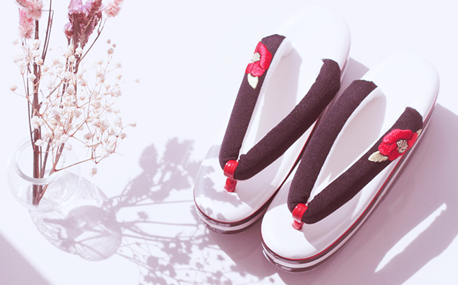 鼻緒にもラインストーンが施されていたり着物の柄に合わせて椿があしらわれているものも。