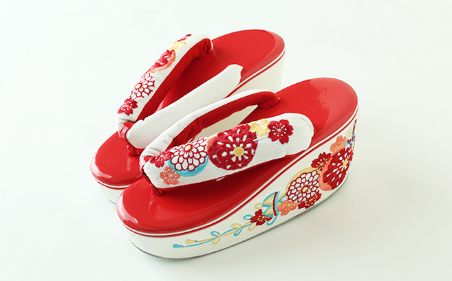 高いヒールの分、鼻緒や草履の側面など見える部分が多くなる分、デザイン性の高いものが人気です。